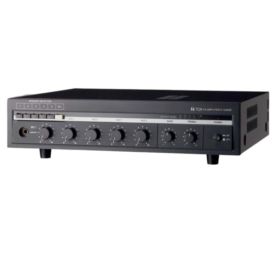 TOA A-1240SS là bộ khuếch đại công suất hiệu suất cao với bộ chọn loa 5-zone phù hợp cho việc phát sóng địa chỉ công cộng hoặc sử dụng nhạc nền. Một nút kết nối tất cả cho phép phát sóng được thực hiện cho tất cả 5 khu. Nó cũng đi kèm với bảo vệ ngắn mạch đầu ra, và mạch bảo vệ nhiệt để tránh thất hỏng hóc thiết bị do nóng quá.